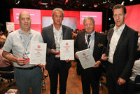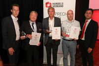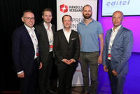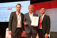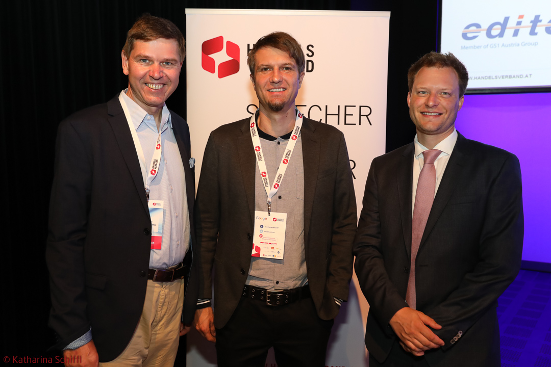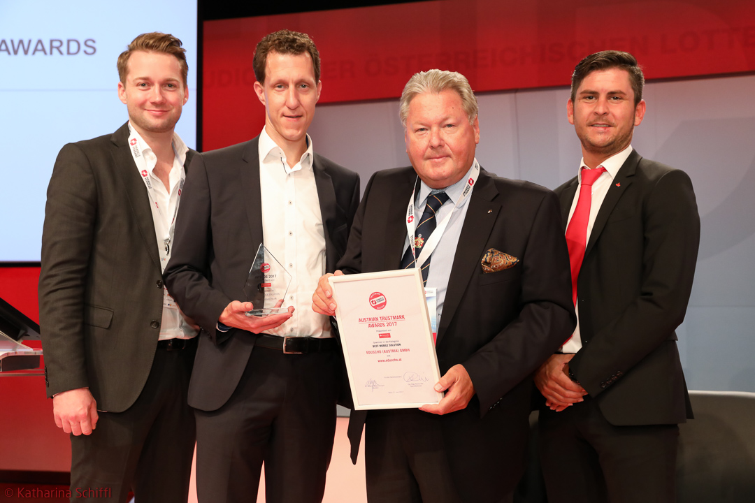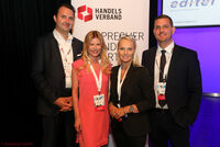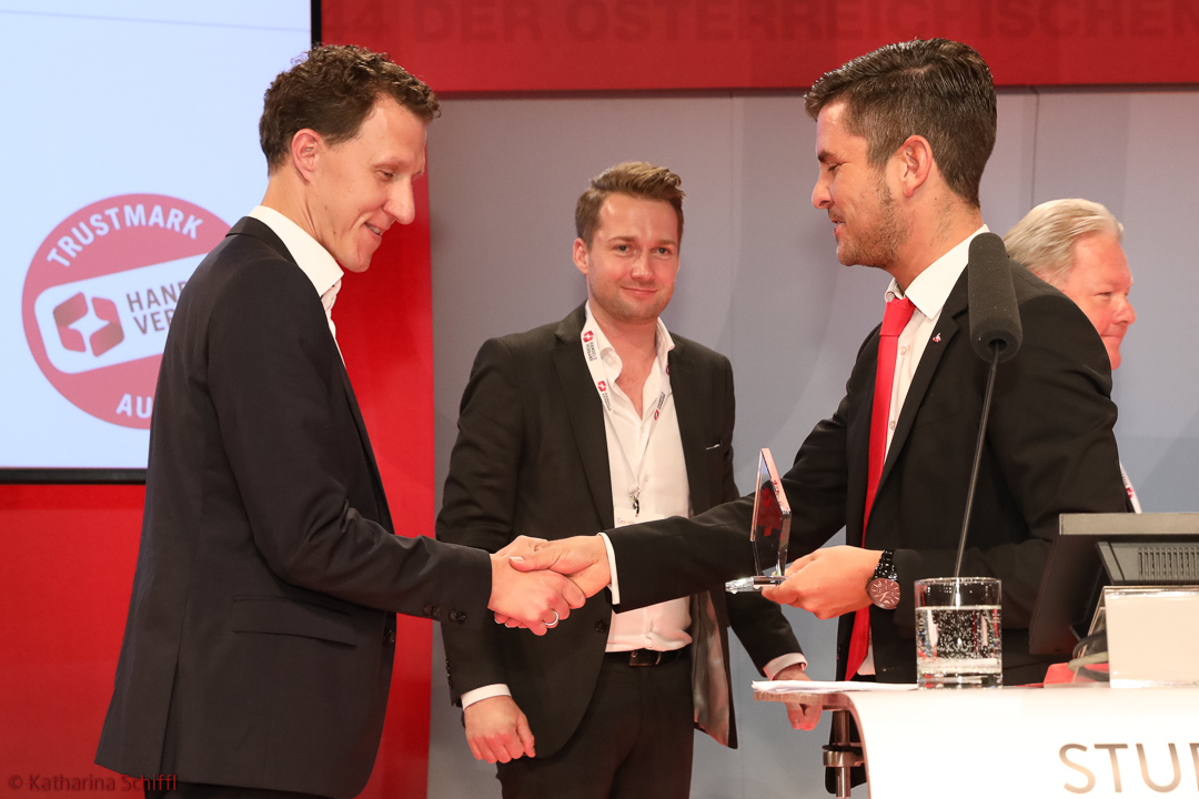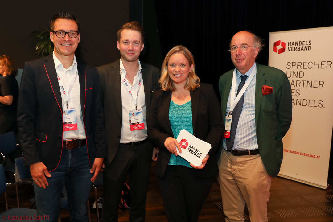 Einen weiteren Programmhöhepunkt bildete die traditionelle Verleihung der Trustmark Austria Awards. Rainer Will, Geschäftsführer des Handelsverbandes, und Karl Jung vom Award Sponsor Santander Consumer Bank überreichten die begehrte Auszeichnung in drei Kategorien. Als Bester Online Shop setzte sich die eCommerce Plattform schaefer-shop.at durch, eduscho.at wurde als beste Mobile Solution ausgezeichnet und in der Kategorie Beste Customer Experience triumphierte der Onlinesop von weltbild.at. Oliver Gassenbauer (Prokurist von Schäfer Shop), Johan Larcher (Geschäftsführer von Weltbild Österreich) sowie KR Harald J. Mayer (Geschäftsführer Tchibo/Eduscho) und Christian Sick (Head of E-Commerce Austria & Switzerland bei Tchibo/Eduscho) nahmen die Preise entgegen.