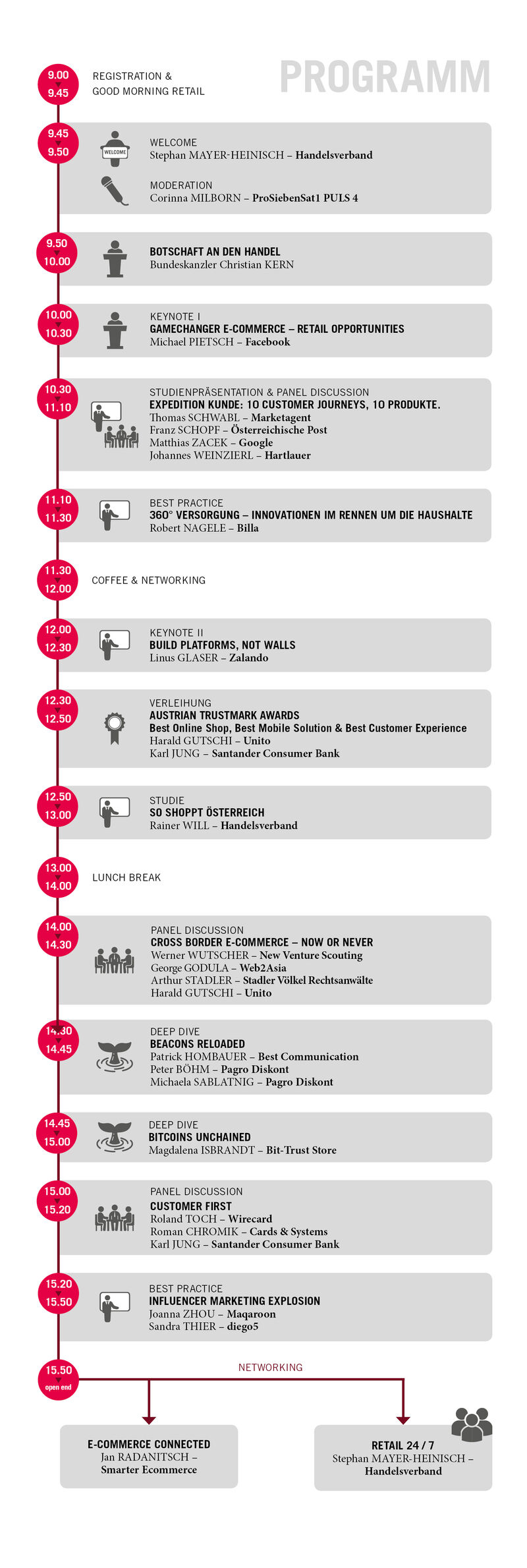 Robert Nagele (Billa), Andreas Kranabitl (Spar), Patrick Kessler (Schweizer Handelsverband), Günther Pfisterer (Hartlauer), Andreas Zinschitz (Kastner & Öhler), Harald J. Mayer (Eduscho), Markus Kienberger (Google), Michael Moser (Kaiser+Kraft), Gerald Gregory (Post E-Commerce), Christoph von Lattorff (Mercateo), Christian Renk (Klana/Sofort), Bernhard Egger (Walbusch), Michael Moser (Kaiser+Kraft), Andreas Winkelmayer (Gebrüder Weiss), Daniel Neumann (Gebrüder Weiss), Alexander Frech (Österreichische Post), Niels Degen (Madeleine Mode), Dieter Zillmann (Hermes Logistik), Alexander Gradl-Noll (Diebold Nixdorf), Rainer Neuwirth (myProduct), Paul Brandstätter (Veloce), Thomas Twardawa (Gebrüder Götz), Claudia Siebert (HSE 24), Eustachius Kreimer (Blue Tomato), Johann Larcher (Weltbild), Jan Radanitsch (Smarter Ecommerce), Julia Stone (Billa) und Karin Saey (Dorotheum).