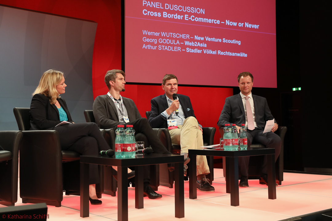 Nach der Mittagspause diskutierten Werner Wutscher (New Venture Scouting), George Godula (Web2Asia) und Arthur Stadler (Stadler Völkel Rechtsanwälte) im Rahmen einer Panel Discussion die faszinierenden Möglichkeiten des Cross Border E-Commerce in Asien. „Die wichtigste Währung im Handel ist das Vertrauen der Kunden. Wenn das verloren geht, wird es schwierig“, erinnerte Business Angel Werner Wutscher an die weitreichenden Folgen des Milchpulver-Skandals in China. Arthur Stadler gab einen Einblick in das Potenzial von Kryptowährungen wie Bitcoin und erinnerte an die Wichtigkeit des Themas Datenschutz/Datensicherheit. „Die Kunden ziehen die jeweilige Rechtsordnung mit sich. Wenn ich Kunden in China bedienen will, muss ich chinesisches Recht einhalten“, so der Jurist. George Godula, selbst seit 2006 in China aktiv, ermutigte die heimischen Händler, den Weg nach Asien zu wagen. „Die Reise vom futuristischen Shanghai nach Europa ist für mich jedes Mal wie eine Reise in die Vergangenheit. Aber ich habe gute Nachrichten: Die Zukunft ist schön, vorausgesetzt sie haben gute Produkte“, formulierte er ein optimistisches Fazit.