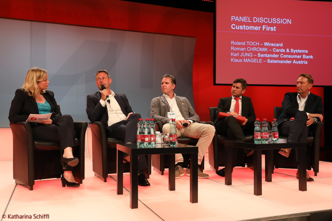 Unter dem Motto "Customer First" diskutierten Roland Toch (Wirecard), Roman Chromik (Cards & Systems), Karl Jung (Santander Consumer Bank) und Klaus Magele (Salamander Austria) in der dritten Panel Discussion über verschiedene Ansätze und Möglichkeiten, E-Commerce und stationären Handel unter einen Hut zu bekommen. „Bei Santander ist Omnichannel aktuell ein riesen Thema Wir versuchen, offline und online bestmöglich zu verknüpfen und damit den Händlern eine Möglichkeit zu geben, ihren Umsatz zu steigern“, bestätigte Karl Jung den aktuellen Trend Richtung kanalübergreifender Strategien. „Wir glauben, dass es heute entscheidend ist, Qualität an allen Ecken und Enden zu liefern und den Kunden wirklich zu begeistern. Das Wichtigste ist nach wie vor Word of Mouth – also dass die Kunden ihre Begeisterung weitertragen und so neue Kunden werben“, so Salamander Austria Geschäftsführer Klaus Magele. „Bezahlen am Smartphone muss so einfach wie möglich sein. Momentan versuchen wir alle, so viel Usability wie möglich reinzubringen“, erinnerte Roland Toch an die Bedeutung hochwertiger Payment Solutions für den Handel. Cards & Systems Geschäftsführer Roman Chromik wiederum plädierte für mehr Offenheit in der Kundenkommunikation: „Heute wissen wir mehr über den Kunden, als er selbst über sich weiß. Aber wir gehen zu intransparent mit den Daten um. So fühlt sich der Kunde dann oft verfolgt oder ausspioniert.“