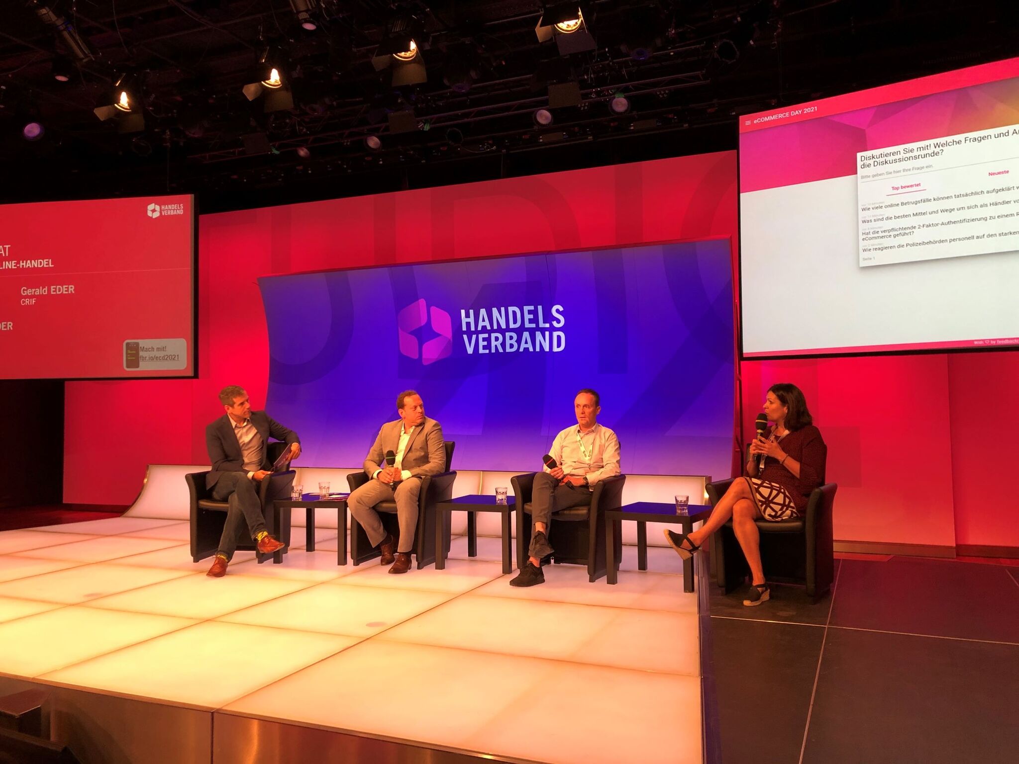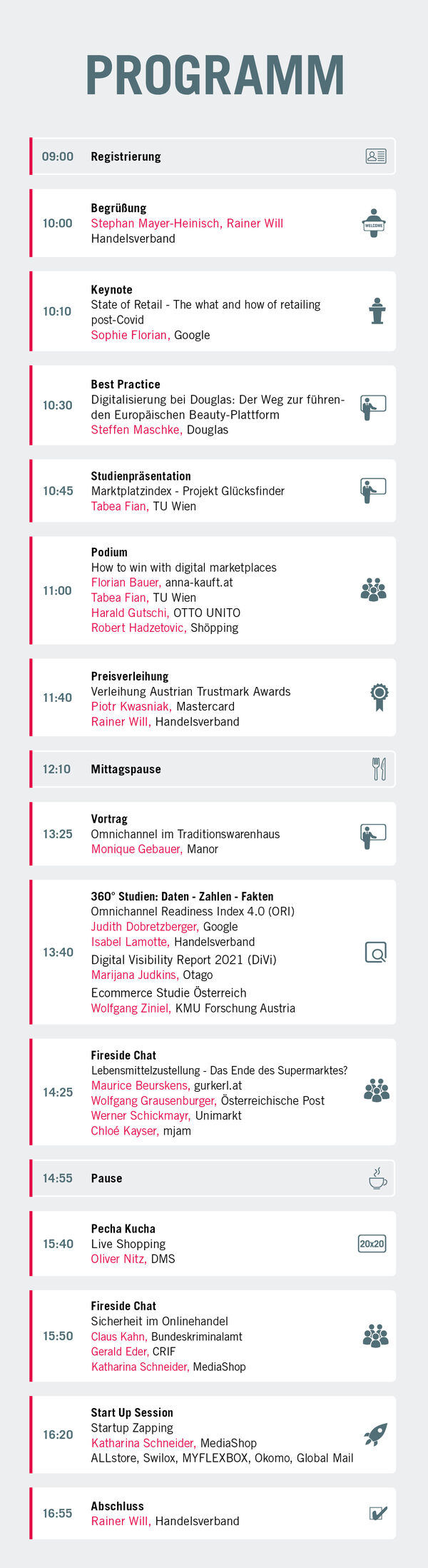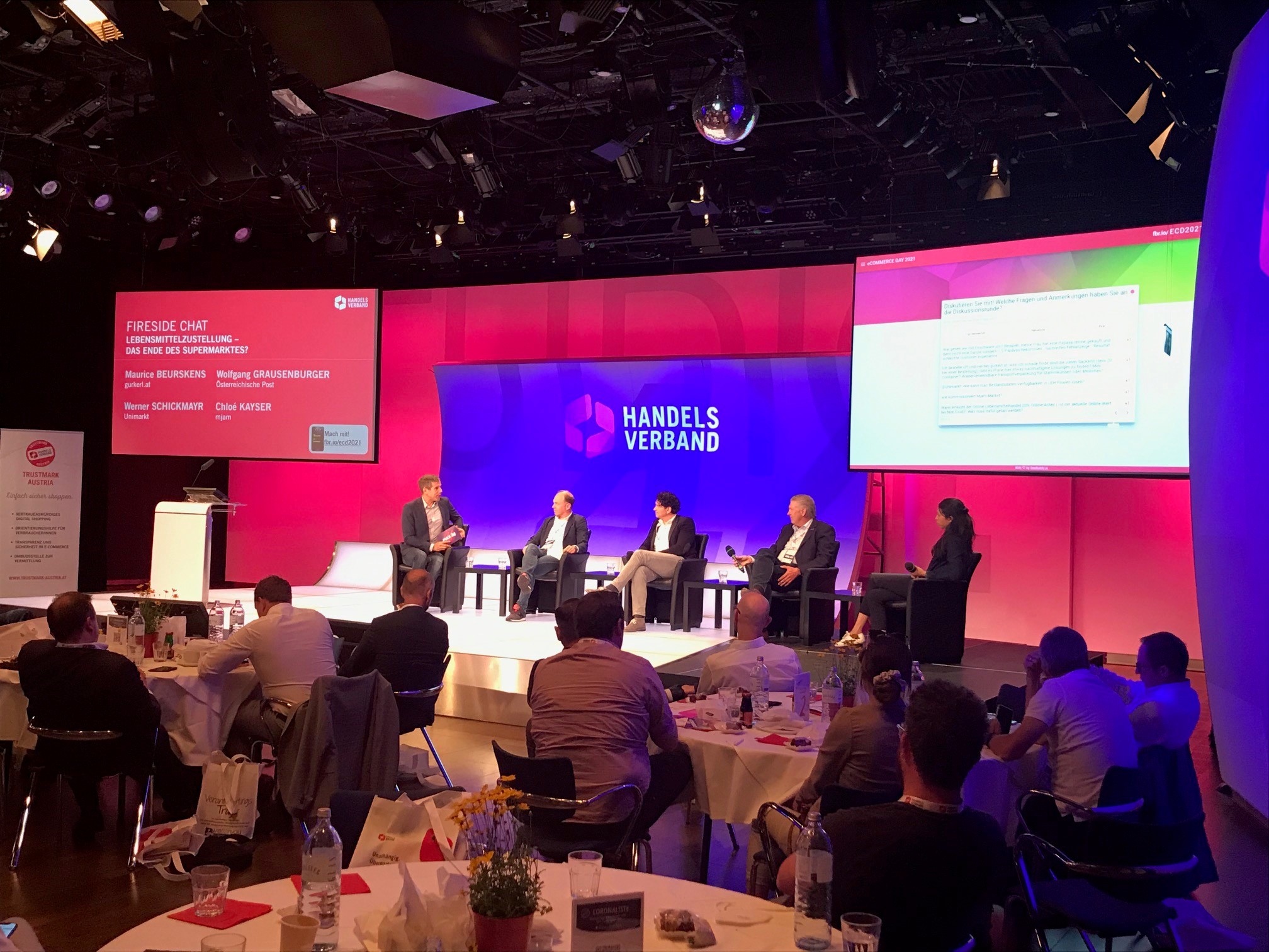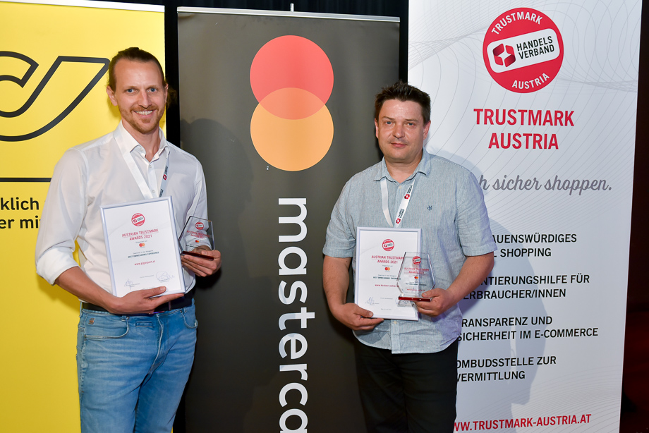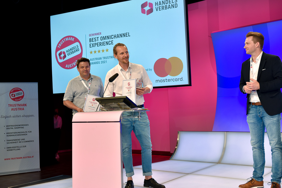 Die drei Fireside-Chats zu digitalen Marktplätzen, neuen Formen der Lebensmittelzustellung und Sicherheit im Onlinehandel rockten Florian Bauer (anna-kauft.at), Tabea Fian (TU Wien), Harald Gutschi (UNITO) und Robert Hadzetovic (Shöpping) sowie Maurice Beurskens (gurkerl.at), Wolfgang Grausenburger (Österreichische Post), Werner Schickmayr (Unimarkt) und Chloé Kayser (mjam) genauso wie Claus Kahn (Bundeskriminalamt), Gerald S. Eder (CRIF) und Katharina Schneider (MediaShop). Es folgte ein weiteres Event-Highlight: die Preisverleihung des heiß begehrten Austrian Trustmark Awards 2021 – unter der Schirmherrschaft von Mastercard – durch Rainer Will und Piotr Kwasniak (Mastercard) für herausragende, innovative eCommerce- und Omnichannel-Lösungen.