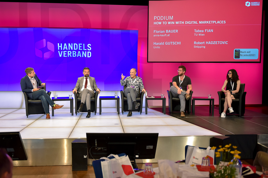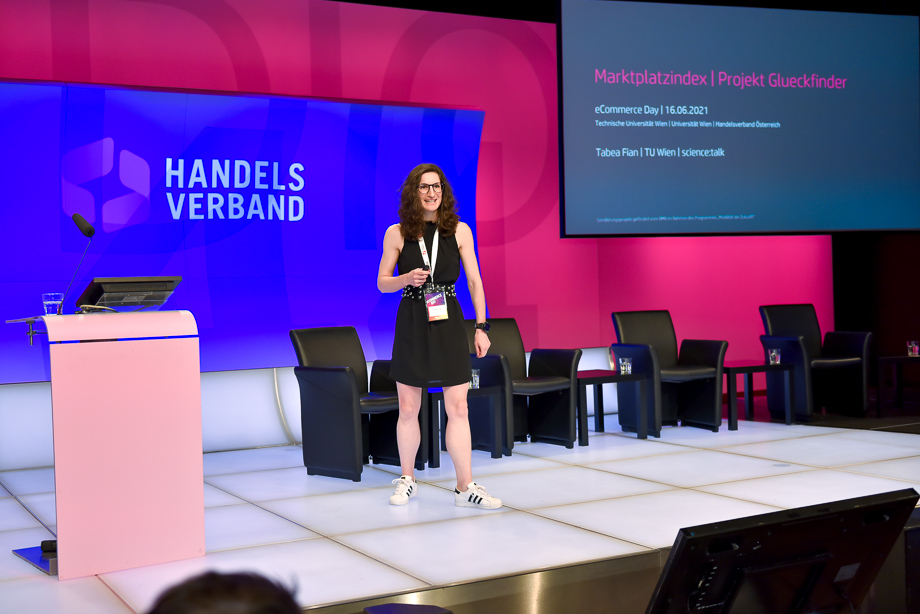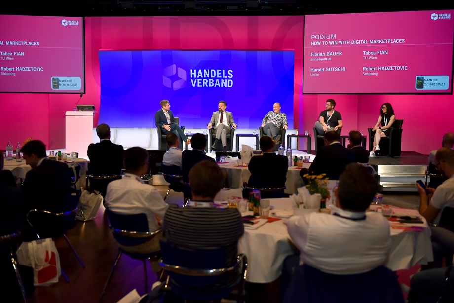 Nach dem leckeren Mittagsmenü wurden dem Publikum erstmalig vier brandneue, für den eCommerce hochrelevante Studien präsentiert. Darunter der Marktplatzindex – Projekt Glücksfinder von Tabea Fian (TU Wien), der Omnichannel Readiness Index 4.0 (ORI), vorgestellt von Judith Dobretzberger (Google) und Isabel Lamotte (Handelsverband), der Digital Visibility Report 2021 (DiVi), präsentiert von Marijana Judkins (Ortago) und zu guter Letzt präsentierte Wolfgang Ziniel (KMU Forschung Austria) die E-Commerce Studie 2021, die einen neuen Umsatzrekord von 10,4 Milliarden Euro ausweist. Die eCommerce Studie Österreich 2021 kann übrigens HIER bestellt werden.