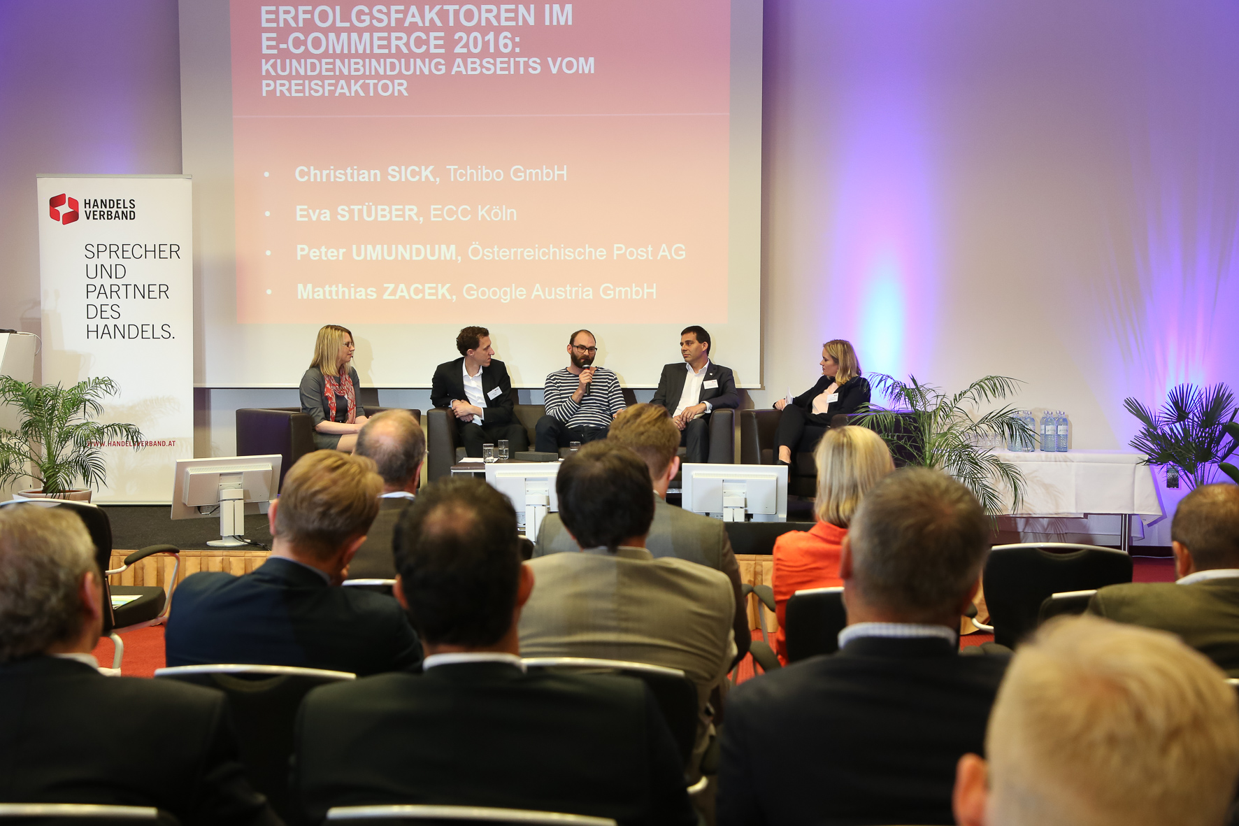 Wer bei seinen Kunden in Österreich online punkten kann, war Thema des nächsten Programmpunkts. Die aktuelle Studie „Erfolgsfaktoren im E-Commerce – Top-Online-Shops in Österreich 2016“ von ECC Köln, Österreichischer Post, Google Austria und dem österreichischen Handelsverband präsentierte Eva Stüber, Leiterin Research und Consulting am ECC Köln. In diesem Jahr schafften es erstmals ausschließlich Multi-Channel-Händler in die Top 10 der besten Online-Shops Österreichs. Trotz hoher Zufriedenheit ist diese bei Käufen über das Smartphone häufig deutlich schlechter als bei Käufen über den PC oder Laptop. Diese Ergebnisse und die daraus zu ziehende Lehren wurden im anschließenden Podiumsgespräch mit den Studienpartnern, vertreten durch Peter Umundum, Post AG, Matthias Zacek, Google, sowie Christian Sick von Eduscho diskutiert.
