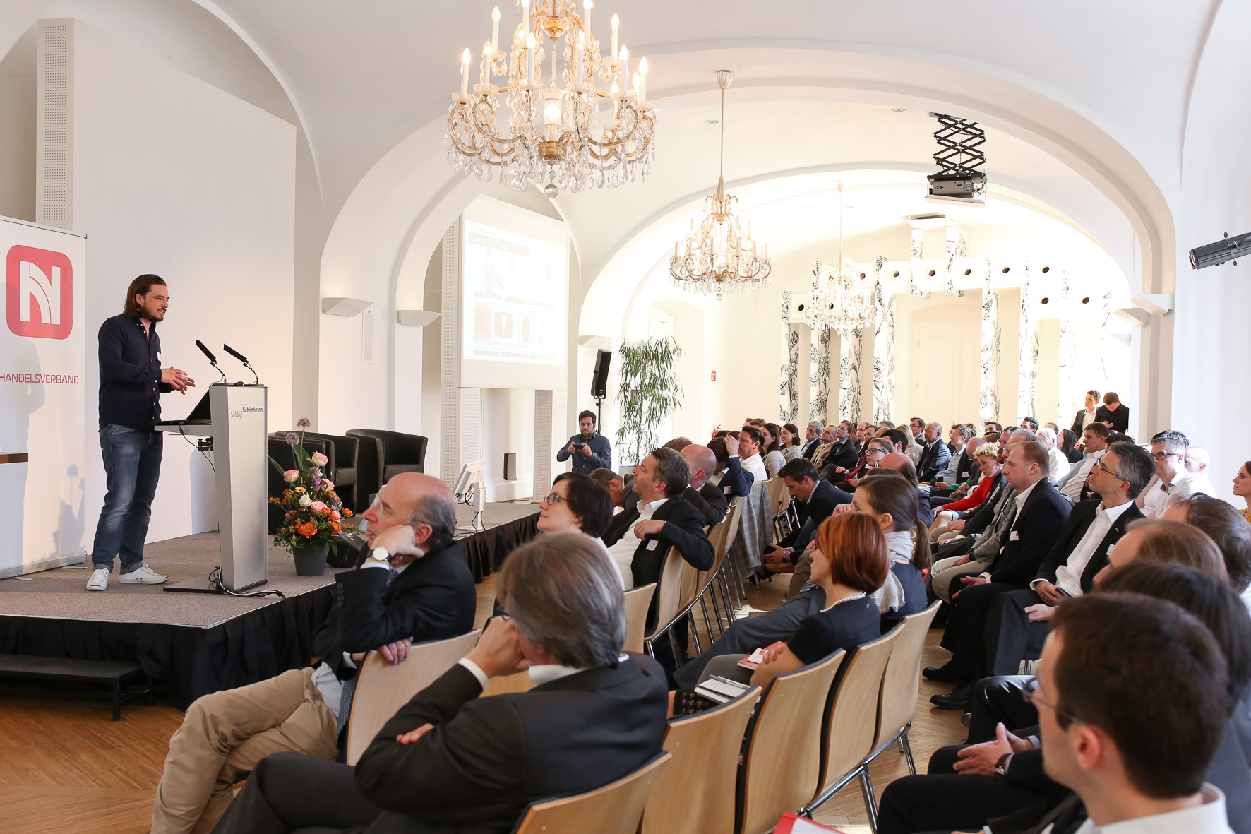 Rund 130 BesucherInnen aus dem Handel folgten der Einladung in das Tagungszentrum des Schloss Schönbrunn, darunter Stephanie Reimann (bauMax), Christian Prokopp (Gewusst wie Drogerie), Johannes Weinzierl (Hartlauer), Michael Sorré (REWE), Andreas Frick (SPAR), Rudolf Roitner (SSI Schäfer Shop) und Klaus Frahm (BestSecret).