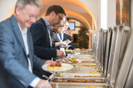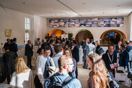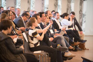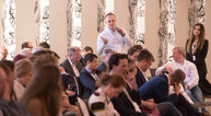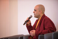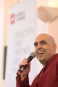 Nach einem intensiven Vormittag hatten sich die Teilnehmer des Handelskolloquiums etwas Entspannung verdient. Der buddhistische Mönch und Achtsamkeitstrainer Gelong Thubten war gefordert – und lieferte. "Nowadays we have our office in our pockets. We are overloaded and distracted. Meditaion helps to reduce stress and gain focus. It’s about focusing the mind", leitete der Oxford-Absolvent seine Chillax-Session ein. 30 Minuten Achtsamkeitsmeditation sorgten wie erhofft für geistige Klarheit, innere Balance und Stressabbau im Saal.