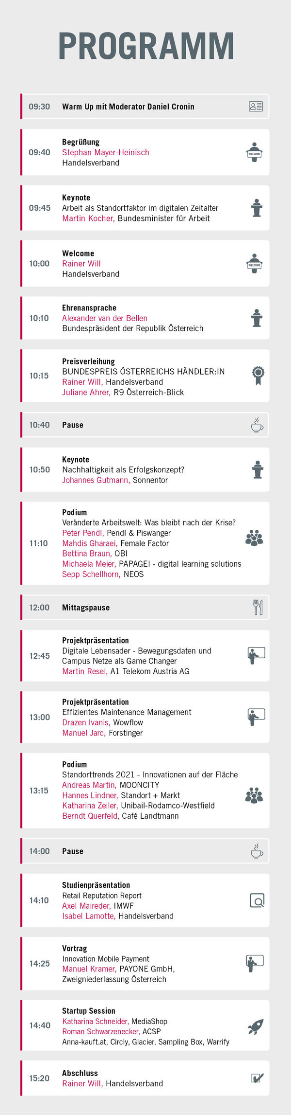 Arbeitsminister Martin Kocher sprach in seiner Eröffnungsrede über Arbeit als Standortfaktor im digitalen Zeitalter, Bundespräsident Alexander Van der Bellen steuerte feierliche Worte zum 100-jährigen Bestehen des Handelsverbandes bei und viele innovative Händler und Startups sowie Stakeholder aus Wirtschaft, Handel, Gastronomie, IT und der Wissenschaft lieferten spannende Key-Notes zu den aktuellen Entwicklungen am österreichischen Markt. Hunderte digitale Teilnehmer waren beim Branchenhighlight live dabei, vernetzten sich durch digitale Features wie das Match-Roulette und diskutierten fleißig mit.