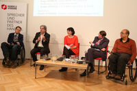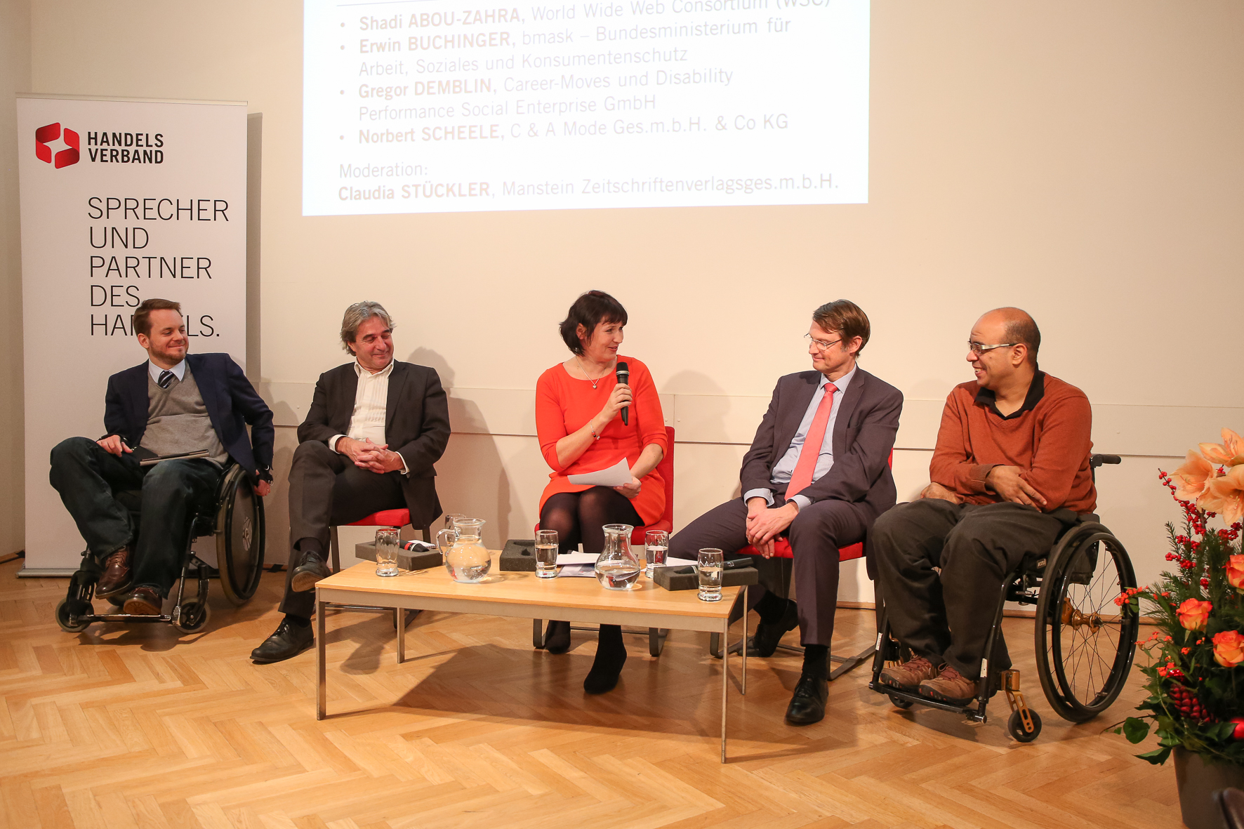 Journalistin Claudia Stückler führte souverän durch die Diskussion an der Shadi Abou-Zahra, Leiter des International Program Office der Web Accessibility Initiative (WAI) des W3C, der ehemalige Sozialminister und jetzige Behindertenanwalt Erwin Buchinger, Gregor Demblin, Social Entrepreneur und Unternehmensberater sowie C&A Geschäftsführer Norbert Scheele teilnahmen.