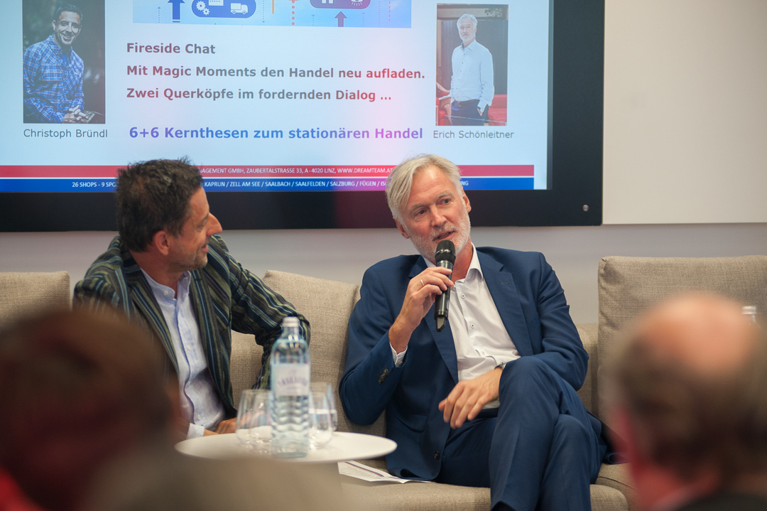 "Zwei Querköpfe im fordernden Dialog" – so wurde der Fireside Chat zwischen Christoph Bründl, Geschäftsführender Gesellschafter von Sport Bründl, und Erich Schönleitner, Eigentümer und geschäftsführender Gesellschafter von DreamTeam, angekündigt. Die beiden Branchenkenner erfüllten die hohen Erwartungen mit Bravour und diskutierten leidenschaftlich ihre gemeinsame Vision einer dynamischen, möglichst innovativen Unternehmenskultur.