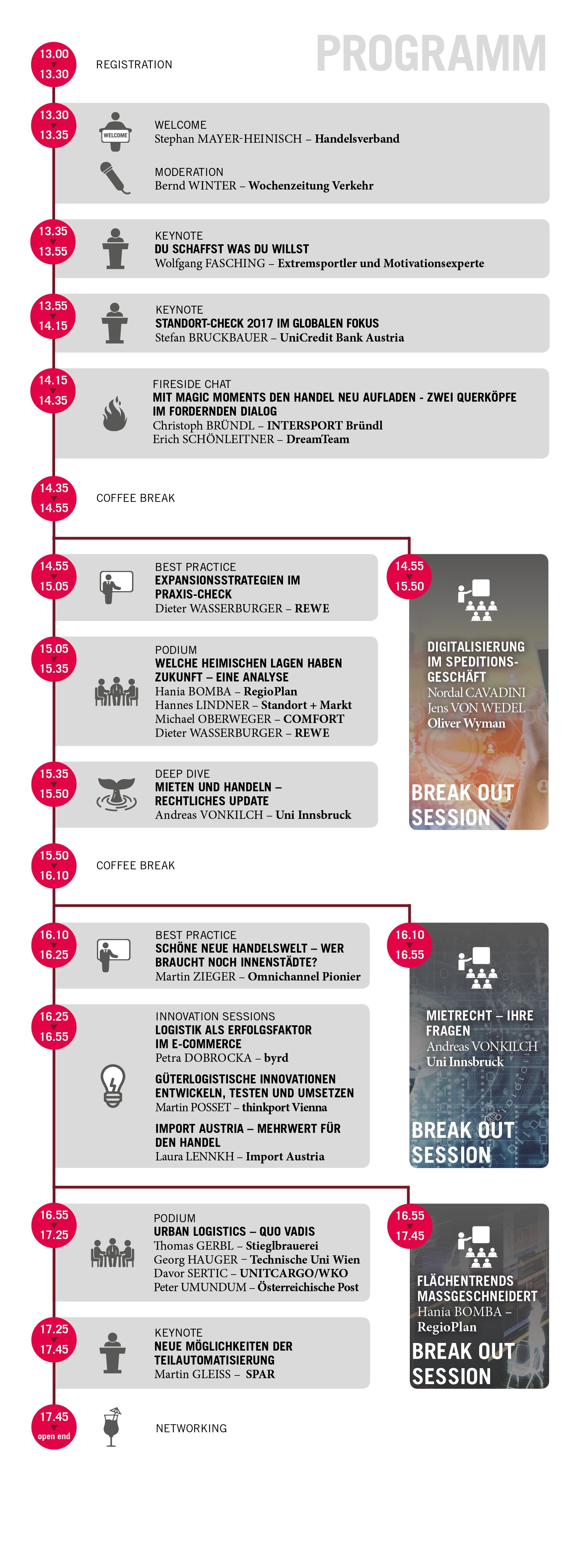 Das Programm der Veranstaltung war so breit wie noch nie angelegt: Von erfolgsversprechenden Filialstrategien und Magic Moments im Shop über die besten Expansionsmaßnahmen und Smart Cities bis hin zu den Tücken des österreichischen Mietrechts und der Zukunft der Innenstädte spannte sich der Bogen. Erstmals wurde auch ein besonderer Schwerpunkt auf den Logistikbereich gelegt und über die neuen Möglichkeiten der Beschaffungs-, Inhouse-, Distributions- und Last-Mile-Logistik gesprochen.