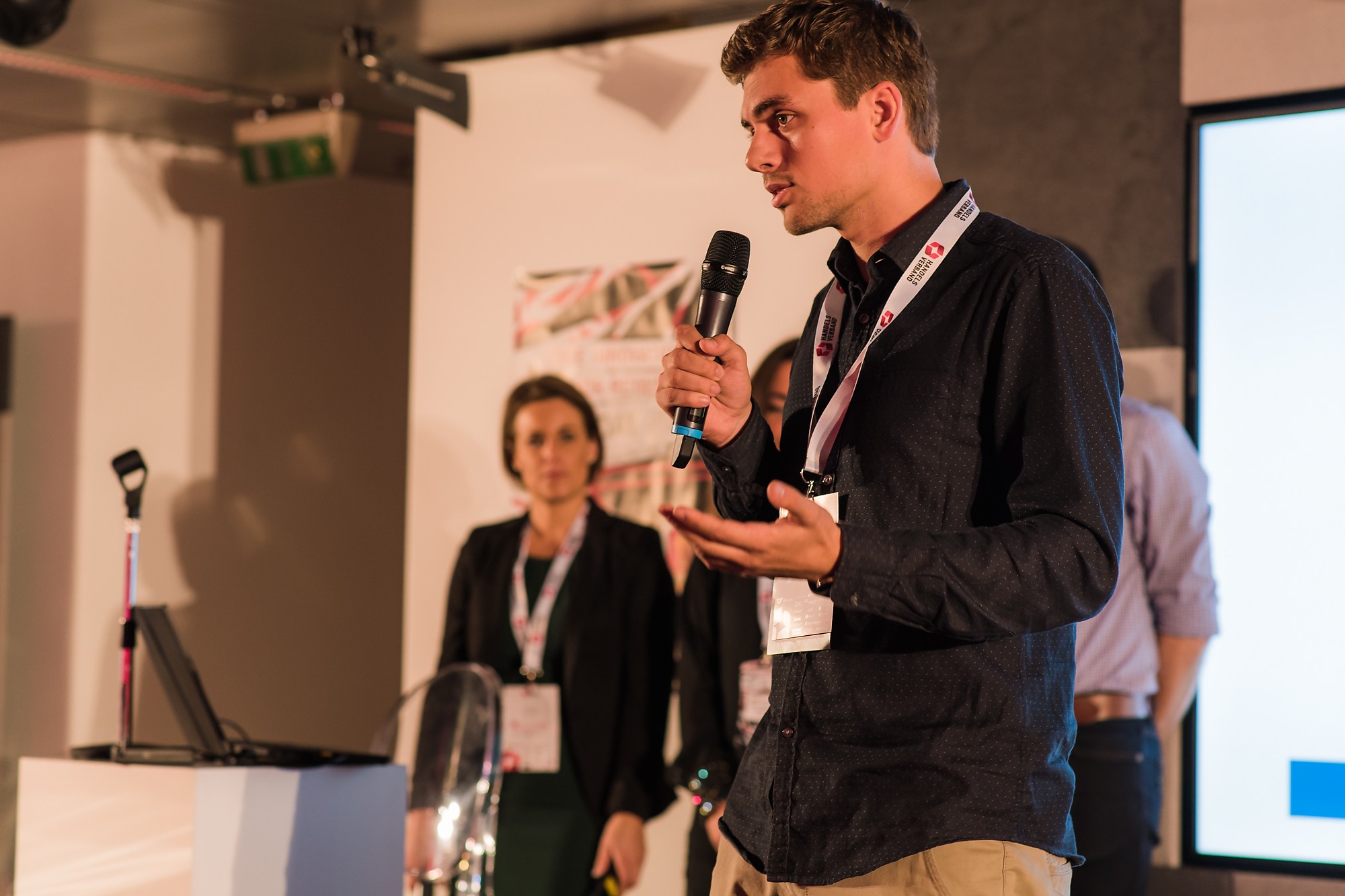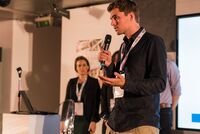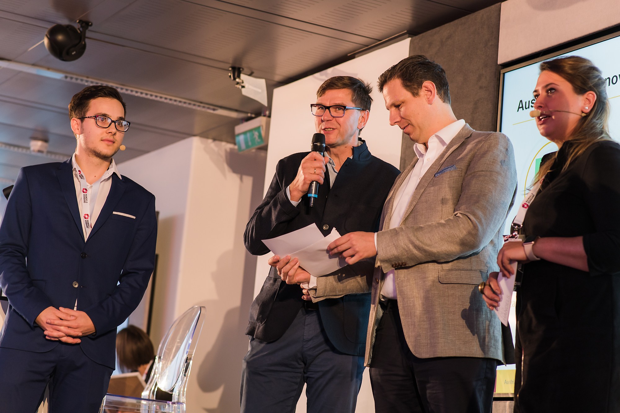 Kathrin Zirn (The Ventury), Patrick Fröschl (Twinster), Albert Vogl-Bader (Carployee) und Johann Bernhardt (Exomys) stellten ihre Geschäftsmodelle im Rahmen von je 2-minütigen Elevator Pitches live on stage vor.
