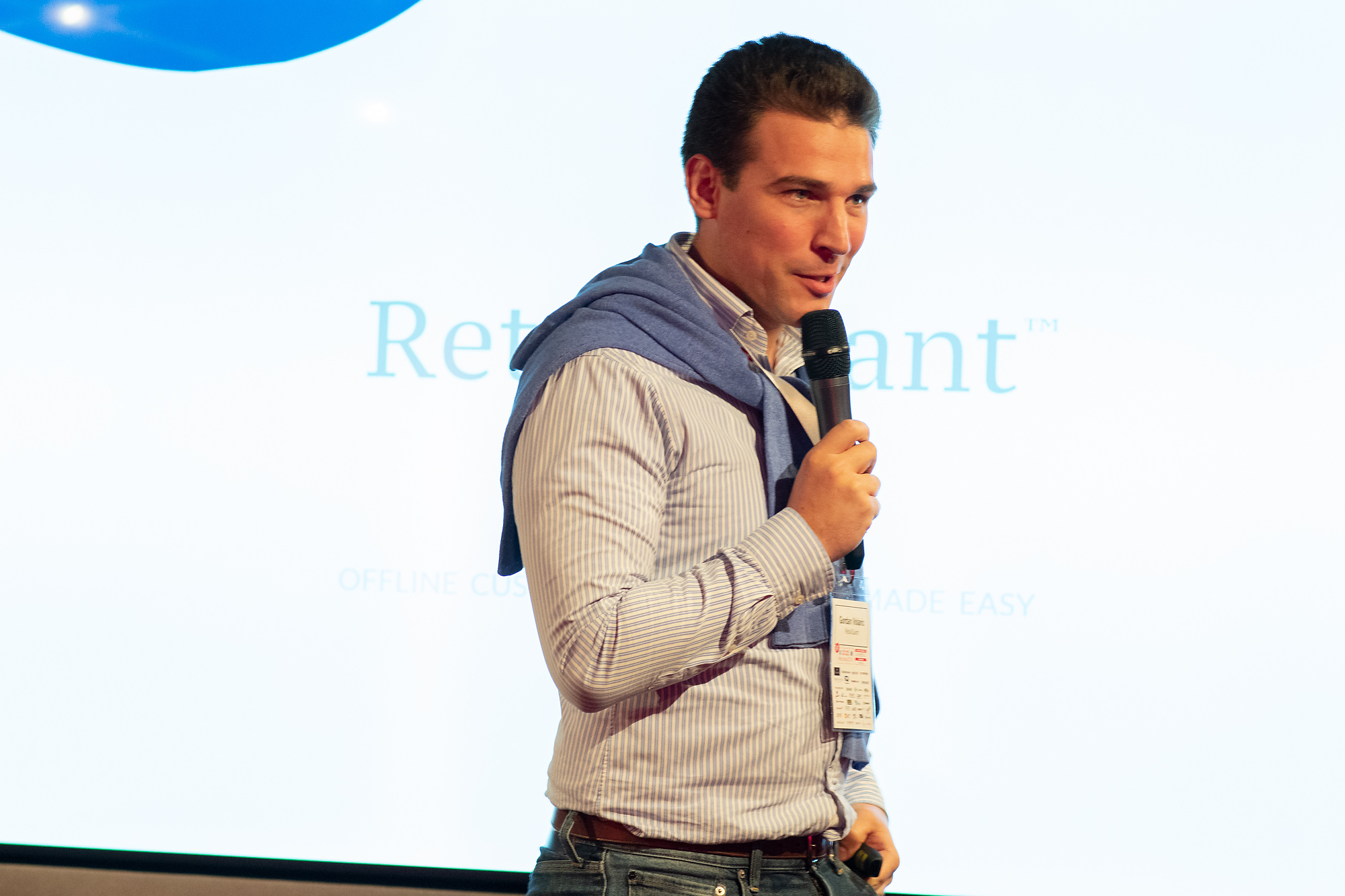 Markus Czanba, Head of Retail bei Kapsch BusinessCom, präsentierte in seinem Pecha Kucha Vortrag das innovative Design Thinking Lab der Kapsch in Wien. Unzählige vielversprechende Geschäftsideen wurden im Lab bereits generiert, die spannendsten stellte Czanba auf der Bühne vor – etwa die Büromöbel-App von Sedus oder eine 360° Musik-Anlage für den Handel.