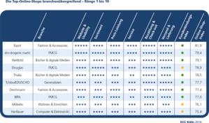 In diesem Jahr schaffen es erstmals ausschließlich Multi-Channel-Händler in die Top 10 der besten Online-Shops Österreichs – Online-Pure-Player werden auf die Plätze verwiesen. Esprit kann sich nach den Zweitplatzierungen in den Jahren 2013 und 2014 nun im zweiten Jahr in Folge den ersten Platz sichern. Der diesjährige Zweitplatzierte, dm-drogerie markt, schafft es erstmals in die Top drei. Weltbild, der dritte im Bunde auf dem Siegertreppchen, hat sich mit dem diesjährigen Abschneiden zurück in die Top 10 gekämpft. Der Online-Shop von Douglas, der 2016 das erste Mal untersucht wurde, erreicht auf Anhieb den vierten Platz und verfehlt die Top drei damit nur knapp. Österreichs branchenübergreifender Top-Online-Shop 2016, Esprit, punktet bei seinen Kunden vor allem in den Bereichen Service, Website & Usability und Bezahlung & Check-out. Esprit erreicht als einziger Online-Shop einen Wert von über 80 Punkten im Online-Shop-Index.