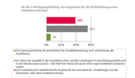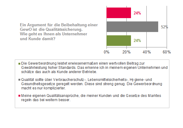 Massiv in Frage stellt das Ergebnis die Funktion der Qualitätssicherung. Nur 24% der Befragten sehen in der GewO ein geeignetes Instrument zur Qualitätssicherung. Jeder Zweite hält Verbraucherschutz-, Lebensmittelsicherheits-, Hygiene- und Gesundheitsgesetze für wesentlich wichtigere Faktoren. 24% setzen auf eigene, strengere Qualitätskriterien und Kundenfeedback: „Im Handel hat der Kunde immer recht. Jemand der die für sein Business nötigen Fähigkeiten nicht mitbringt, wird ohnehin scheitern. Ob mit oder ohne Reglementierung. Warum aber tüchtigen Geschäftsleuten den Erfolg verwehren, nur weil unnötige bürokratische Hürden geschaffen werden“, gibt Mayer-Heinisch zu denken.