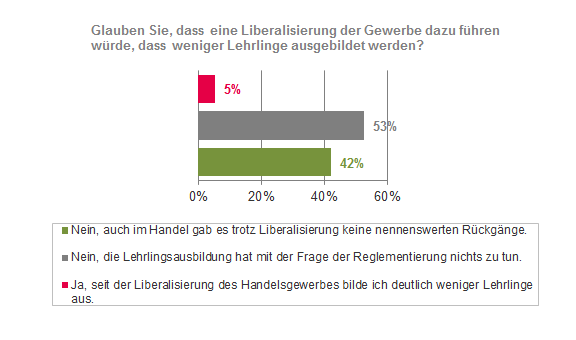 Seit 2002 ist das Handelsgewerbe ein freies Gewerbe, so dass in der Regel zur Ausübung kein Befähigungsnachweis erforderlich ist. Immer wieder wird bei der Diskussion um die Gewerbeordnung argumentiert, dass diese für eine funktionierende Lehrlingsausbildung sorge. Ein Argument, das die Umfrage widerlegt. Lediglich 6 % anerkennen die Ausbildungsqualität als Argument für die GewO. 56% führen die Qualität in der Ausbildung eher auf die Leistungen im Ausbildungsbetrieb und in der Berufsschule zurück. 39 % fordern, die Ausbildung für Handelsberufe ganz neu zu Denken. Die Lehrlingszahlen im Handel sind - unter Berücksichtigung der demographischen Entwicklung - nach der Liberalisierung stabil geblieben.