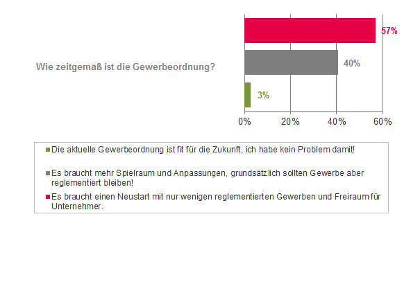 57% befürworten einen Neustart mit nur wenigen reglementierten Gewerben. 40% sprechen sich für mehr Spielraum und Anpassungen bei der bestehenden Gewerbeordnung aus. „Wir reden von einem Gesetz, das von der wirtschaftlichen und gesellschaftlichen Entwicklung längst überholt wurde. Ergebnisorientiert über die Reformierung einer Gewerbeordnung zu reden die über 150 Jahre alt ist, sollte kein Sakrileg sein, sondern die Plicht jedes verantwortungsvollen Managers – egal ob in der Privatwirtschaft oder auf politischer Ebene“, so Mayer-Heinisch.