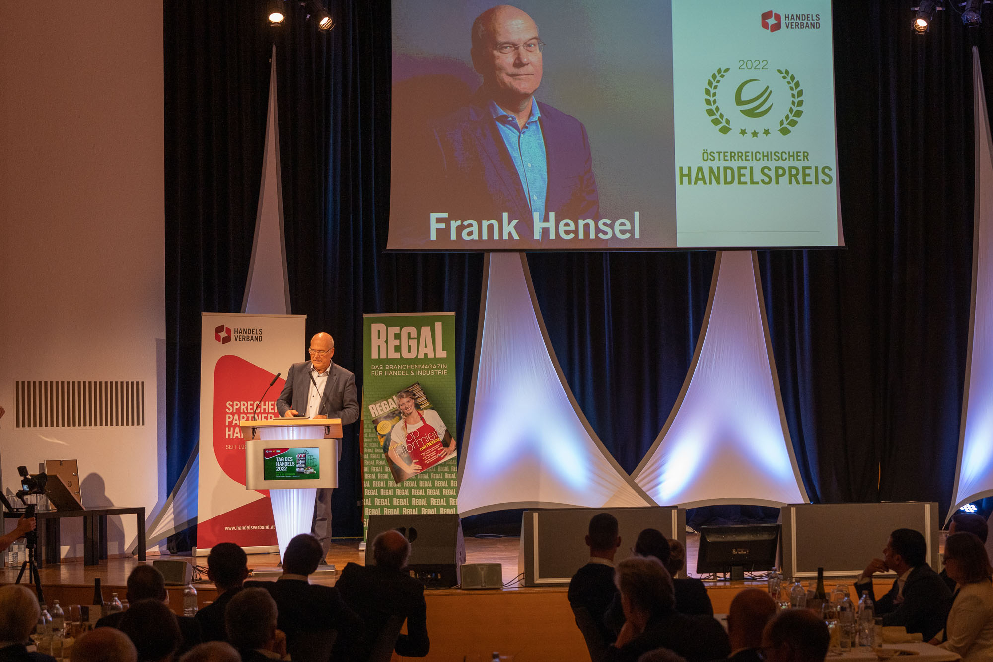 "Je älter man wird, desto mehr Auszeichnungen bekommt man. Diese hier ist aber was ganz Besonderes. Es ist für mich eine Ehre und Anerkennung, als gebürtiger Deutscher den Österreichischen Handelspreis entgegennehmen zu dürfen. Herzlichen Dank für dieser großartigen Preis an den Handelsverband, der sich zur Speerspitze unserer Interessenvertretung entwickelt hat", so Frank Hensel in seiner Rede.