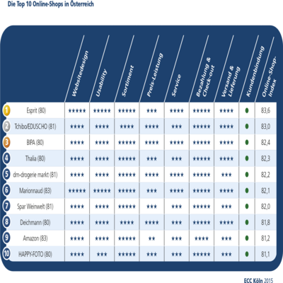 Neue Studie „Erfolgsfaktoren im E-Commerce – Top-Online-Shops in Österreich 2015“ von ECC Köln, Handelsverband Österreich, Österreichischer Post und Google Austria veröffentlicht. Esprit ist bester Online-Shop aus Kundensicht. Drogerie- und Kosmetikanbieter stark unter Top 10 vertreten.